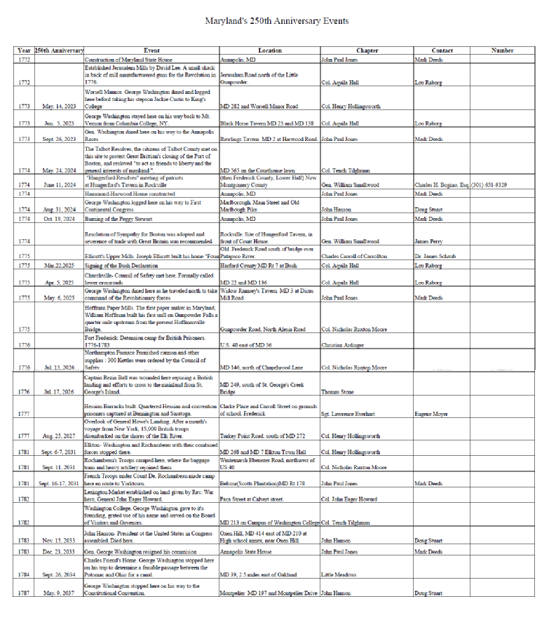 We ask for you help. If there are other notable Revolutionary War and/or Independence related events in what is now Anne Arundel County please reach out and let us know. Also if you have ideas of the best way to recognize these events please give us your ideas. Send your comments or ideas to 250th@johnpauljonessar.org . Thank you.