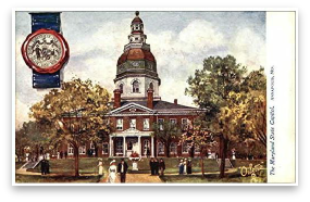 The first organization for descendants of Revolutionary War Patriots was the Society of the Cincinnati, formed May 10, 1783, by George Washington and officers of the Continental Army. The Centennial of the signing of the Declaration of Independence in 1876 fostered a patriotic resurgence and on October 22, 1875, in San Francisco, Dr. James Cogswell organized the second society of Revolutionary War descendants, the California "Sons of the Revolutionary Sires." The Maryland Society was organized on April 20, 1889, when thirty-six charter members met in the Old Senate Chamber in the State House in Annapolis. It was in that very same room that General George Washington had resigned his commission as Commander of the Continental Army. It is the eighth oldest state society. Since it was organized, over 3600 have become members. Three "Real Sons" were members, two were clergymen: Rev. John G. Morris, charter member No. 20, and Rev. Samuel Kramer, charter member No. 42. Maryland's third "Real Son" was Captain Edward Bassett Waples, charter member No. 555. Seven Maryland Society members have been National Presidents: General. Gov. Edwin Warfield, Henry Stockbridge, Mayor James H. Preston, Henry F. Baker, G. Ridgely Sappington, Judge Wilson K. Barnes, and Carl F. Bessent. Finally, the various Societies held a Congress in New York City. The National Society Sons of the American Revolution was organized at Fraunces Tavern on the 100th Anniversary of the Inauguration of George Washington as First President of the United States. The date was April 30, 1889. Marylanders at that Congress included Lt. James C. Cresap, USN elected Secretary General and the Vice-President. The Maryland Society promoted the adoption of the American’s Creed written by William Tyler Page, No. 675. The Maryland Society erected a monument to the "Maryland 400" in Brooklyn, NY; the Revolutionary War Monument in Mount Royal Plaza, Baltimore; placed large stone markers at the graves of Governor William Paca, General William Smallwood, and General Mordecai Gist; marked the graves of General John Edgar Howard, John Paul Jones, and John Hanson. It has also marked "Mann's Tavern," site of the Annapolis Convention in 1786.